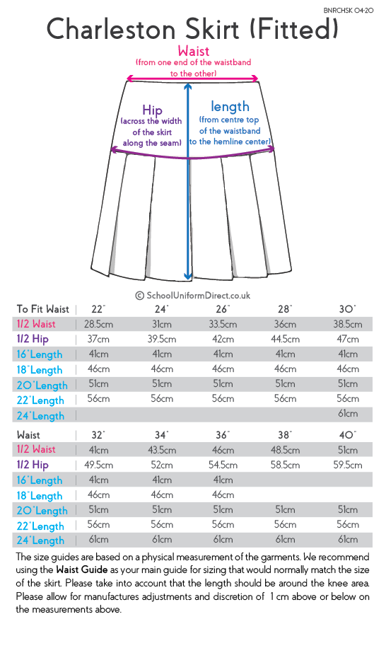 PLEASE NOTE: THIS SKIRT MUST COME BELOW THE KNEE FOR IT TO BE ALLOWED BY THE SCHOOL. THIS IS ALSO A SPECIAL ORDER ITEM AND MAY TAKE UP TO 2 WEEKS TO ARRIVE. Charleston... The Modern Classic. This superb quality skirt has hand sewn pleats and is made with a unique fabric for comfort. Made from polyester, viscose & elastane, the Charleston has a back zip, deep yoke and all round knife pleats.