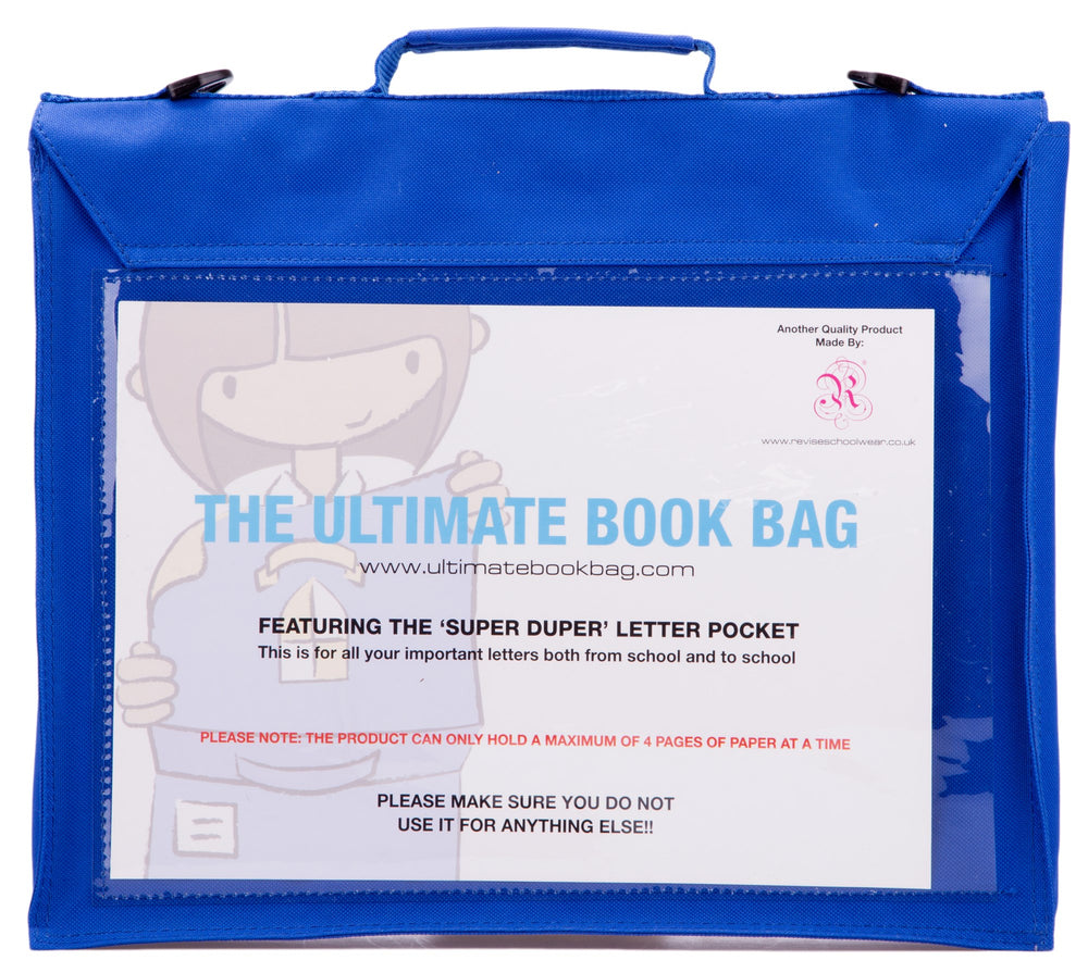 The Ultimate Book Bag is here! featuring a unique patent design. A bottle Holder on the front (to avoid the spills in the bag!) A rear Clear pocket for those important letters! Made from 420D Nylon, this product is waterproof for the inside contents! Also Available is the Accessory Pack (purchased separately) - For £4.99 includes a shoulder strap, shoulder pad and matching pencil case. When purchased with the Ultimate Book Bag the accessory Pack is at a reduced price of £3.49.