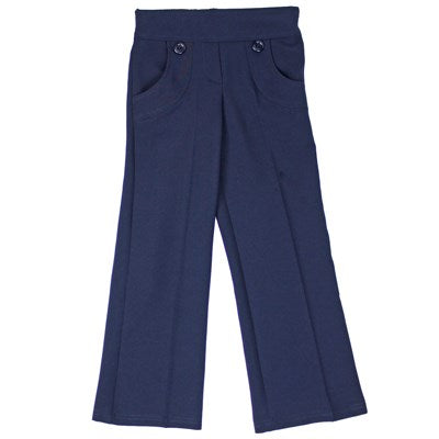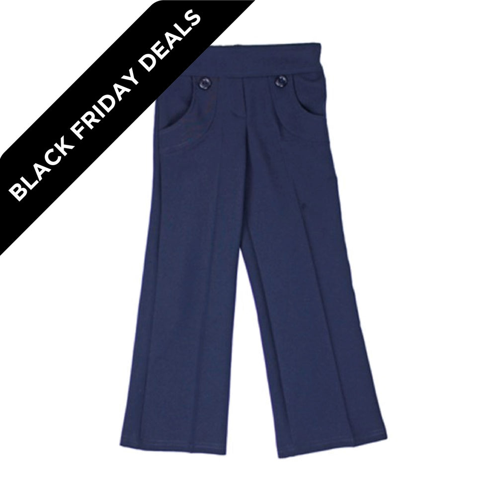 This product has limited stock and sizes, grab a great deal whilst stocks last! These popular trousers are ideal for little girls to wear, with an elastic back for ease on and off. Its got 2 front pockets, with a circular detail. Lovely fashion cut, but still perfect for school! These are 100% soft feel polyester.