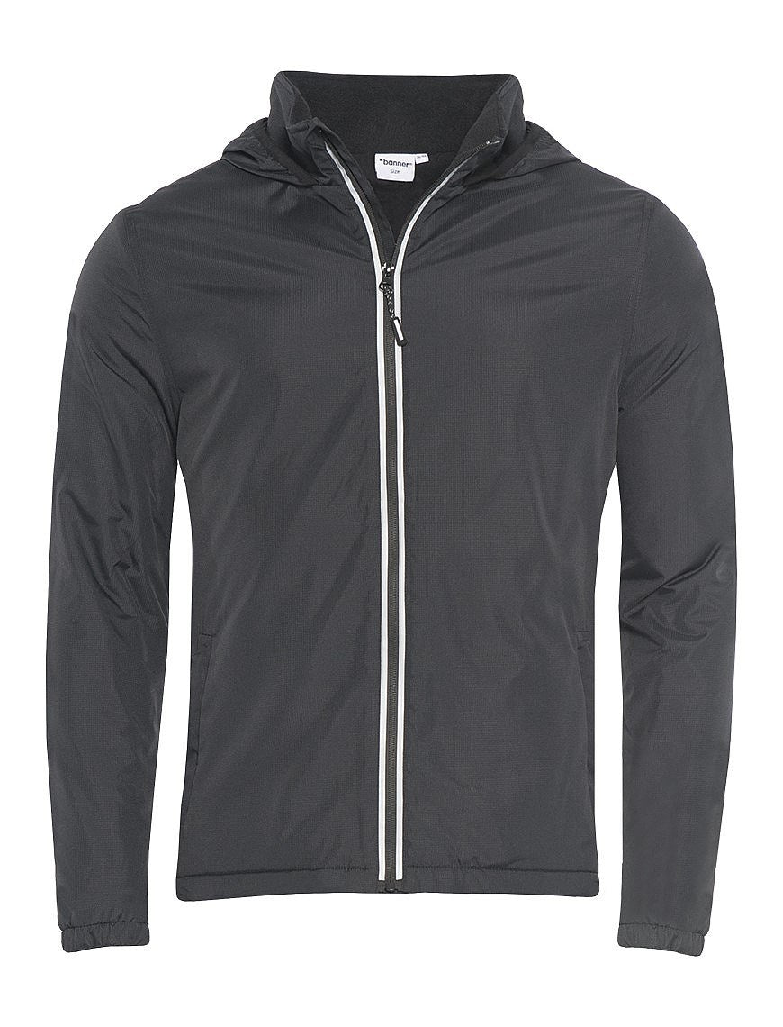 Water resistant hooded jacket with silver reflective tape details Elasticated cuffs and foldaway hood Side pockets with zip