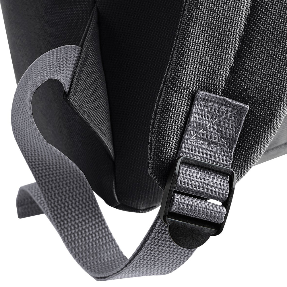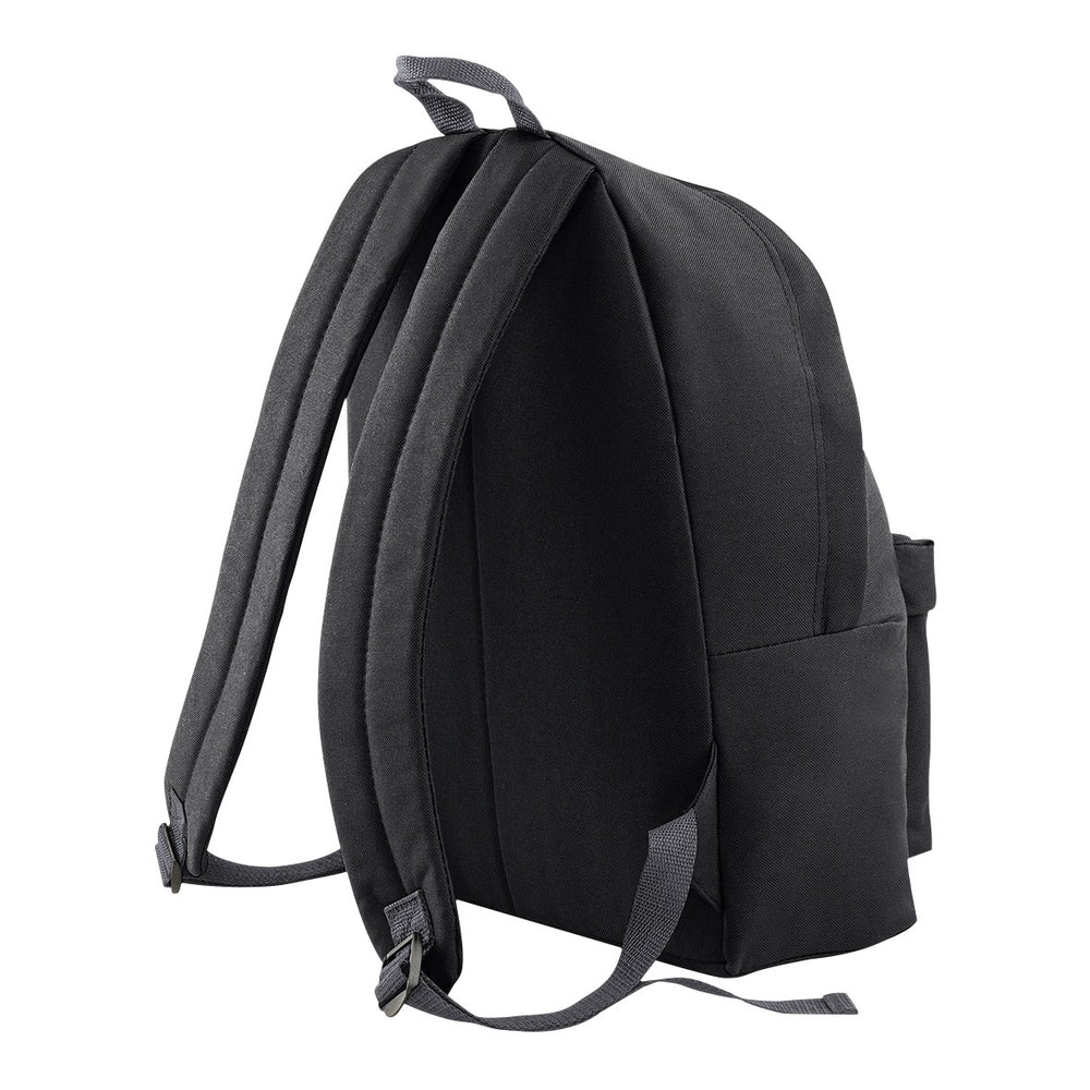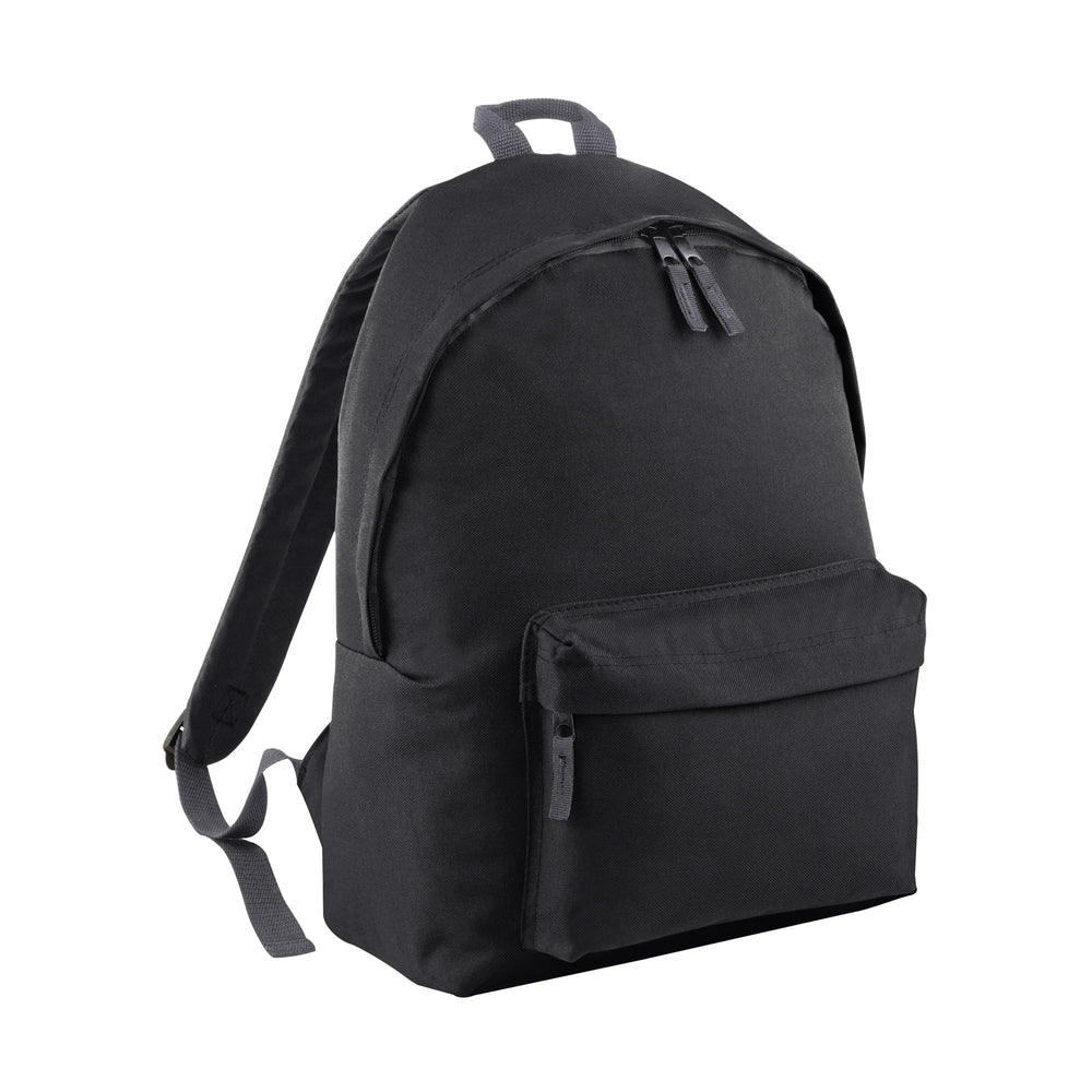 Metallic zips and pullers Zippered main compartment Zippered front pocket Padded adjustable shoulder straps Padded back panel Grab handle Dimensions: 34 x 45 x 23cm Capacity: 22 litres