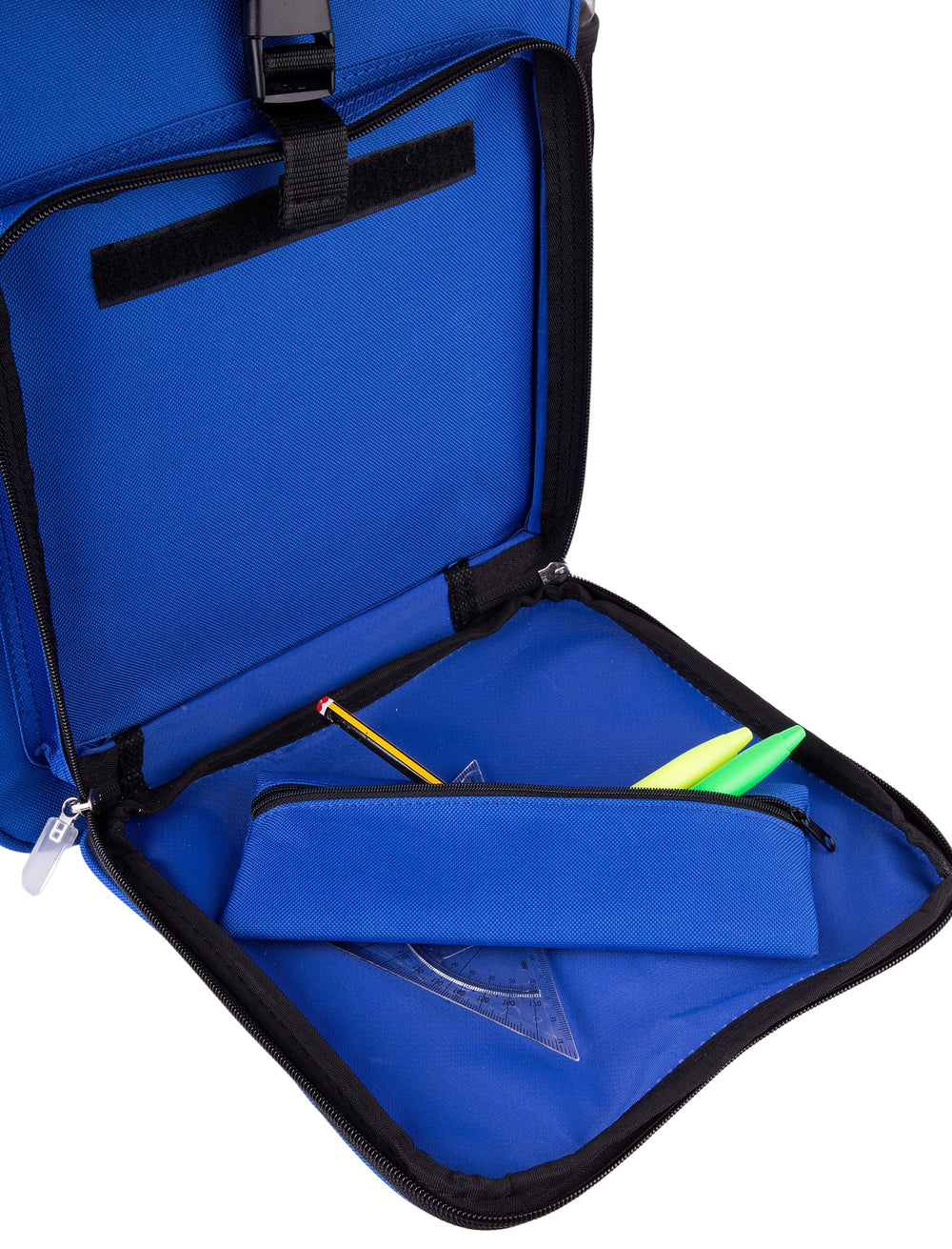 The practical junior school bag designed to carry everything a child needs for school Front pocket containing pen holder and detachable pencil case. Shoulder straps have Blazer buddy lining to avoid pilling of garments. Special rubber feet protectors give added protection.