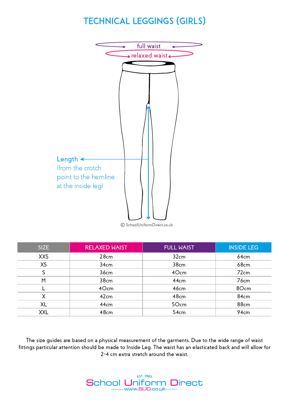 Compulsory for Years 10-13 students taking GCSE / A Level dance Optional for Years 7-9 students instead of PE trousers/shorts in dance lessons 240gsm 90% Polyester, 10% Spandex Fabric A higher elasticated waistband provides a secure fit Ankle length Easy care Fewer panelled seams allows ease to add multiple embellishments Quick dry fabric too keep you warm and dry Thermal Balance